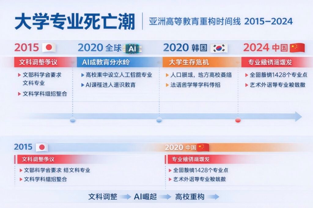 【記者青城,東京報道】 2025年底,中國教育部的一紙通知引發廣泛關注:四川大學一次性砍掉39個本科專業,涵蓋動畫、音樂學、材料化學等;中國傳媒大學也「一口氣」撤銷了翻譯、攝影等16個專業方向。 無獨有偶。放眼整個東亞,一場關於「大學專業存亡」的劇烈洗牌正在同步上演。 在日本,法政大學、立教大學等名校開始整合傳統文學與區域研究專業;在韓國,數十個傳統文科專業因「零招生」而自動撤銷;在新加坡,南洋理工大學將部分人文學院邊緣課程直接整合進「跨學科框架」,獨立專業身份不復存在。 這不僅是教育界的內部整頓。它是全球產業鏈重構、人口結構性坍塌與人工智能海嘯共同作用下的結果。 看似意外,實屬必然。